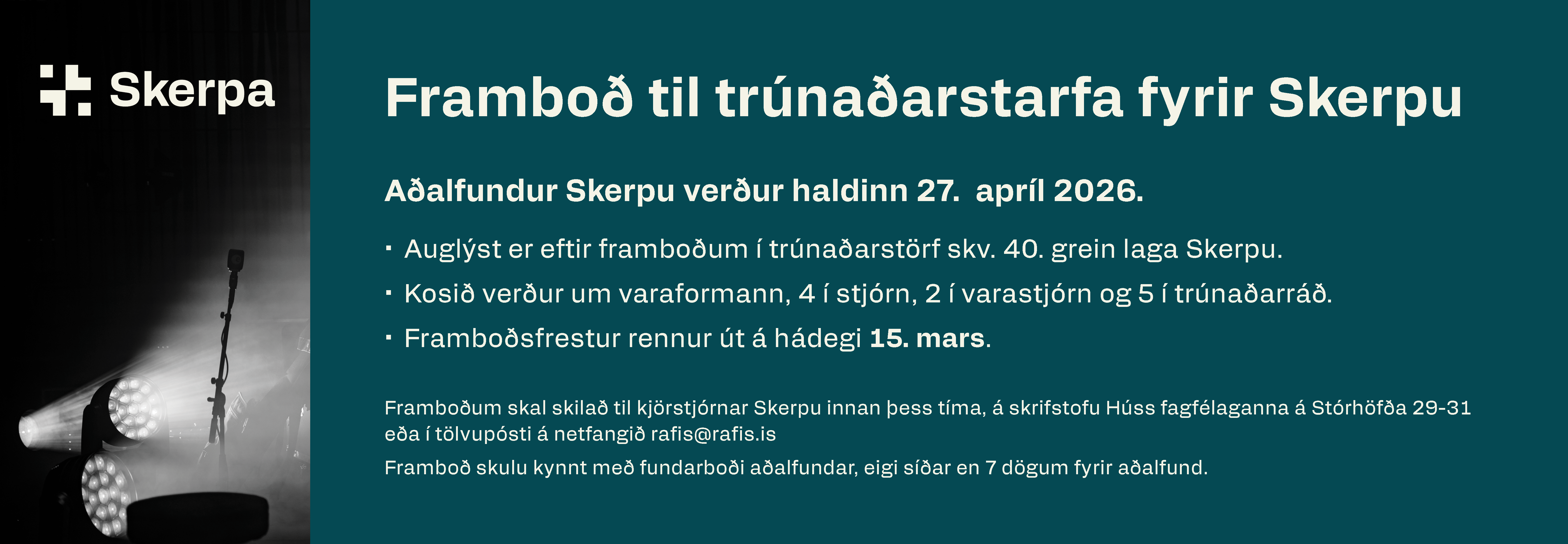 • Framboðum skal skilað til kjörstjórnar Skerpu innan þess tíma, á skrifstofu Húss fagfélaganna á Stórhöfða 29-31 eða í tölvupósti á netfangið rafis@rafis.is